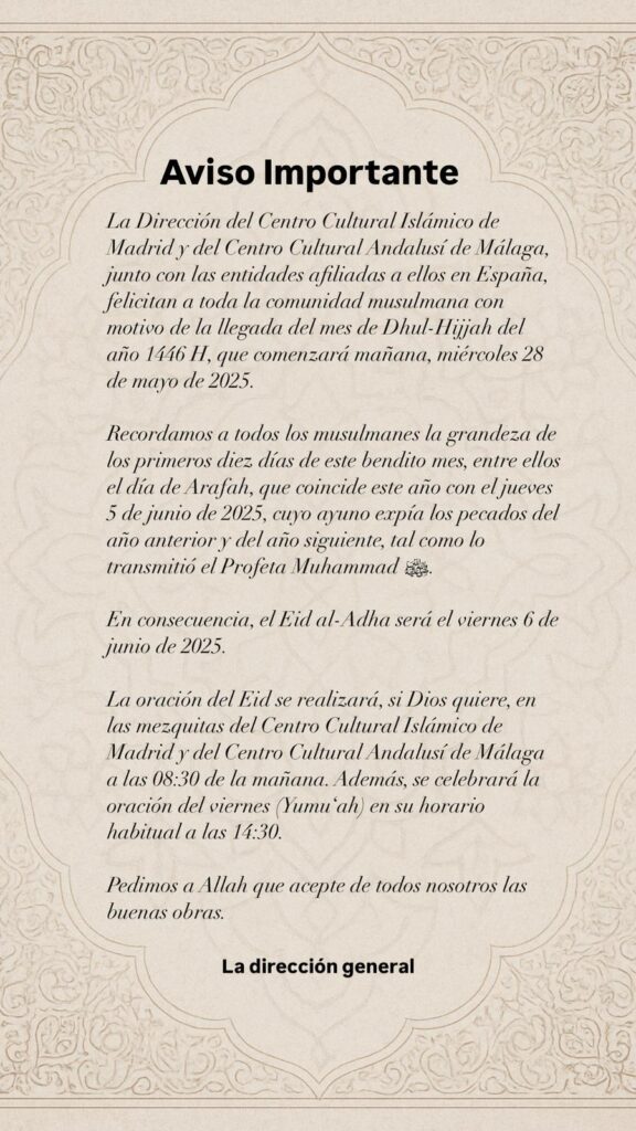 Aviso Importante Última modificación de la entrada:junio 3, 2025 Let's change the world together Compartir este contenido Se abre en una nueva ventana Se abre en una nueva ventana Se abre en una nueva ventana Se abre en una nueva ventana Se abre en una nueva ventana Se abre en una nueva ventana Se abre en una nueva ventana Se abre en una nueva ventana Se abre en una nueva ventana Se abre en una nueva ventana Leer más artículos Entrada anteriorMatriculación de antiguos alumnos/تسجيل التلاميذ القدامى Siguiente entradaConcurso Coránico de Ramadán 2026 También podría gustarte Foto de la entrada julio 14, 2021 Video Yumu’ah 04/06/2021 junio 4, 2021 Encuentro público con diferentes representantes religiosos de Málaga diciembre 11, 2021 Deja una respuesta Cancelar la respuestaComentarioIntroduce tu nombre o nombre de usuario para comentar Introduce tu dirección de correo electrónico para comentar Introduce la URL de tu web (opcional) Guarda mi nombre, correo electrónico y web en este navegador para la próxima vez que comente. Δ Este sitio usa Akismet para reducir el spam. Aprende cómo se procesan los datos de tus comentarios.