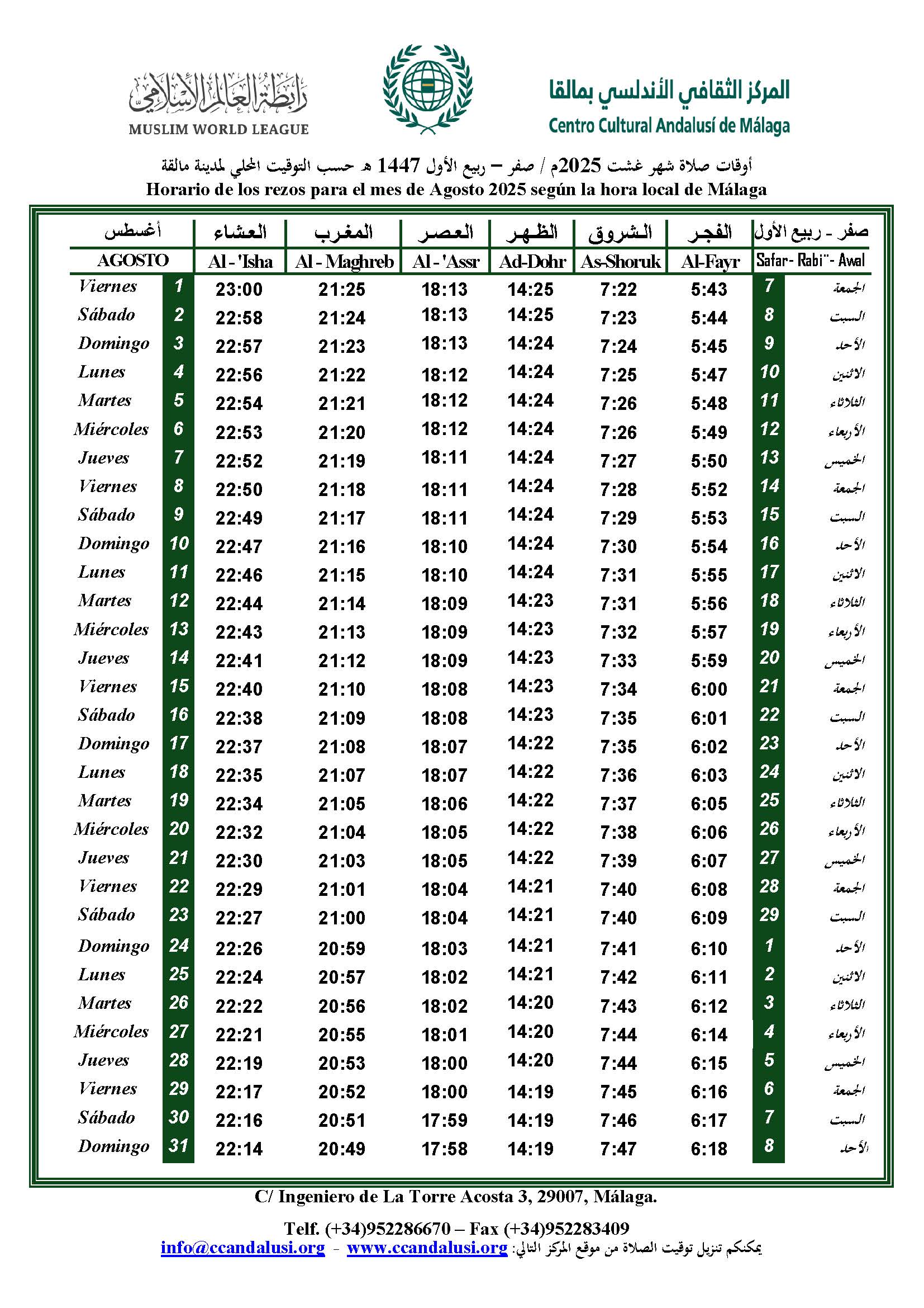 Horario de oración | Agosto 2025 Última modificación de la entrada:agosto 1, 2025 Descargar PDF Descargar PDF Let's change the world together Compartir este contenido Se abre en una nueva ventana Se abre en una nueva ventana Se abre en una nueva ventana Se abre en una nueva ventana Se abre en una nueva ventana Se abre en una nueva ventana Se abre en una nueva ventana Se abre en una nueva ventana Se abre en una nueva ventana Se abre en una nueva ventana Leer más artículos Entrada anteriorHorario de oración | Junio 2025 Siguiente entradaHorario de oración | Septiembre 2025 También podría gustarte Horario de oración | Febrero 2026 enero 31, 2026 Horario de oración | enero 2025 enero 17, 2025 Horario de oración – Octubre 2024 octubre 1, 2024 Deja una respuesta Cancelar la respuestaComentarioIntroduce tu nombre o nombre de usuario para comentar Introduce tu dirección de correo electrónico para comentar Introduce la URL de tu web (opcional) Guarda mi nombre, correo electrónico y web en este navegador para la próxima vez que comente. Δ Este sitio usa Akismet para reducir el spam. Aprende cómo se procesan los datos de tus comentarios.