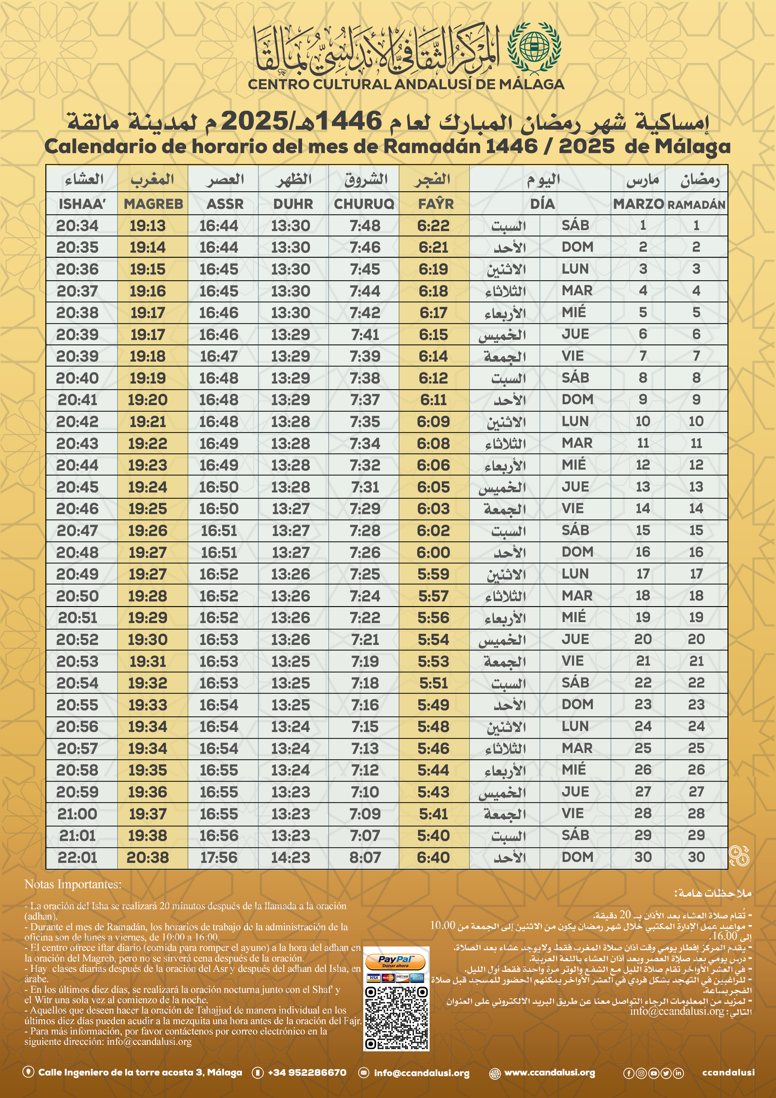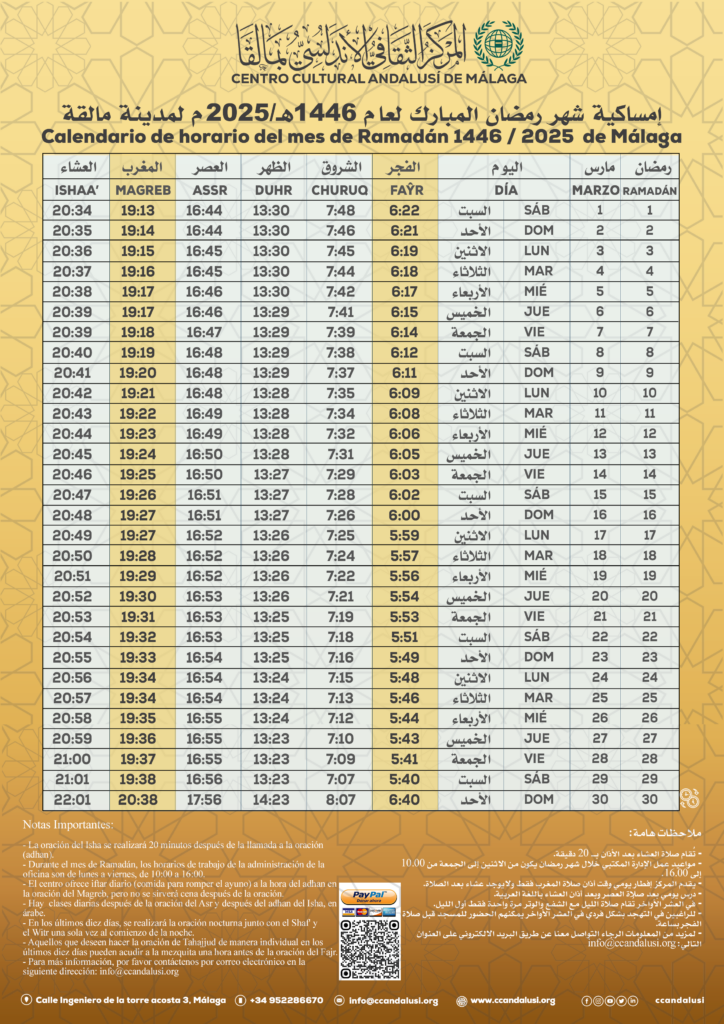Horario de Ramadan 2025 Última modificación de la entrada:febrero 28, 2025 Descargar PDF Descargar PDF Let's change the world together Compartir este contenido Se abre en una nueva ventana Se abre en una nueva ventana Se abre en una nueva ventana Se abre en una nueva ventana Se abre en una nueva ventana Se abre en una nueva ventana Se abre en una nueva ventana Se abre en una nueva ventana Se abre en una nueva ventana Se abre en una nueva ventana Leer más artículos Entrada anteriorCOMUNICADO | إعلان Siguiente entradaEl Centro Cultural Andalusí de Málaga organiza un concurso coránico durante el mes de Ramadán 1446 También podría gustarte Horario de oración | enero 2025 enero 17, 2025 Concurso de Ramadán Memorizar y recitar el Sagrado Corán 1447 / 2026 febrero 19, 2026 Horario de oración | Junio 2025 junio 1, 2025 Deja una respuesta Cancelar la respuestaComentarioIntroduce tu nombre o nombre de usuario para comentar Introduce tu dirección de correo electrónico para comentar Introduce la URL de tu web (opcional) Guarda mi nombre, correo electrónico y web en este navegador para la próxima vez que comente. Δ Este sitio usa Akismet para reducir el spam. Aprende cómo se procesan los datos de tus comentarios.
